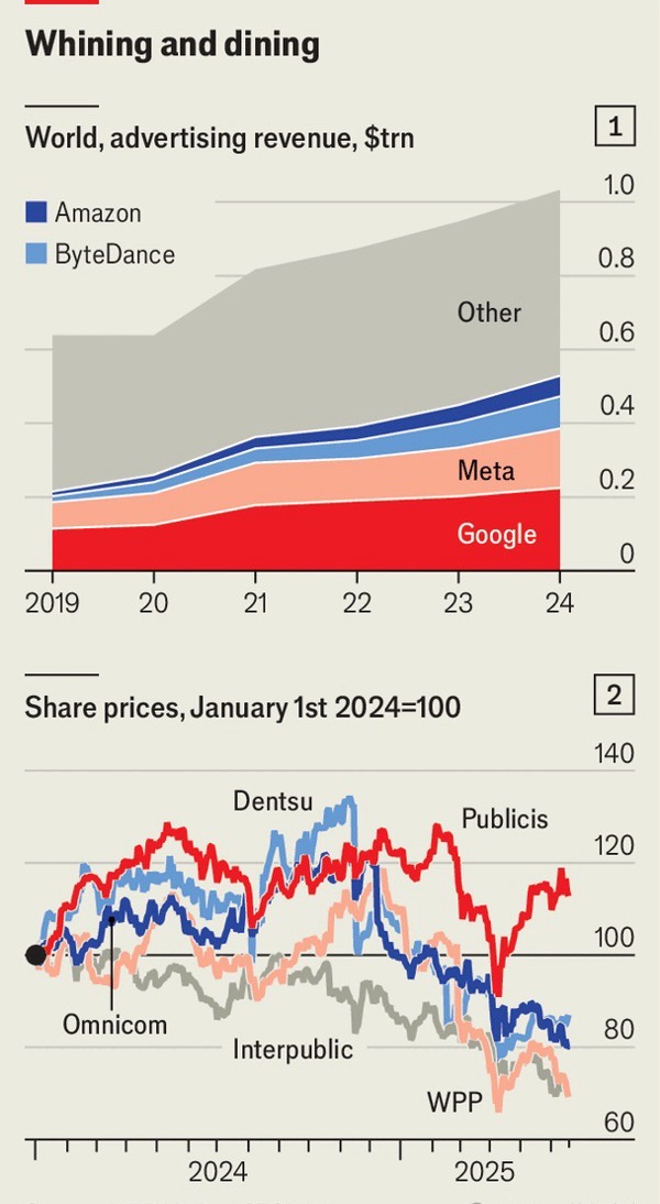 AI seems to be strengthening their grip. Machine learning improves ads’ targeting: Meta’s AI-powered Advantage+ system claims to increase brands’ return on ad spending by 22%, while Google’s Performance Max product raises sales by over 10%. Google has begun experimenting with ads in its AI-powered search mode, which it says could be still more effective. Users’ AI queries are two to three times longer than ordinary search queries, meaning the firm knows not just what people are looking for, but why. For brands placing ads, “AI has the most potential to improve business outcomes that they’ve seen in the last 20 years,” believes Sean Downey, president for the Americas at Google.